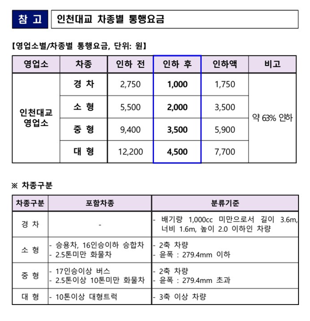 인천대교는 유료도로법 기준에 따라 차량을 1종부터 5종까지 구분합니다.